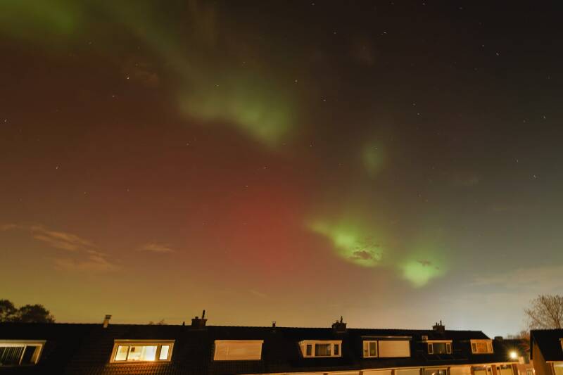 Ik ben naar de zolder gegaan om uit het dakkapel te kijken en ja hoor, daar was het! Recht voor mijn neus, een grote roze "vlek" en een felgroene "lijn". Wauw, wat was dit mooi! Dit had ik wel een keer in Zweden gezien, maar nu was het gewoon in Nederland.
